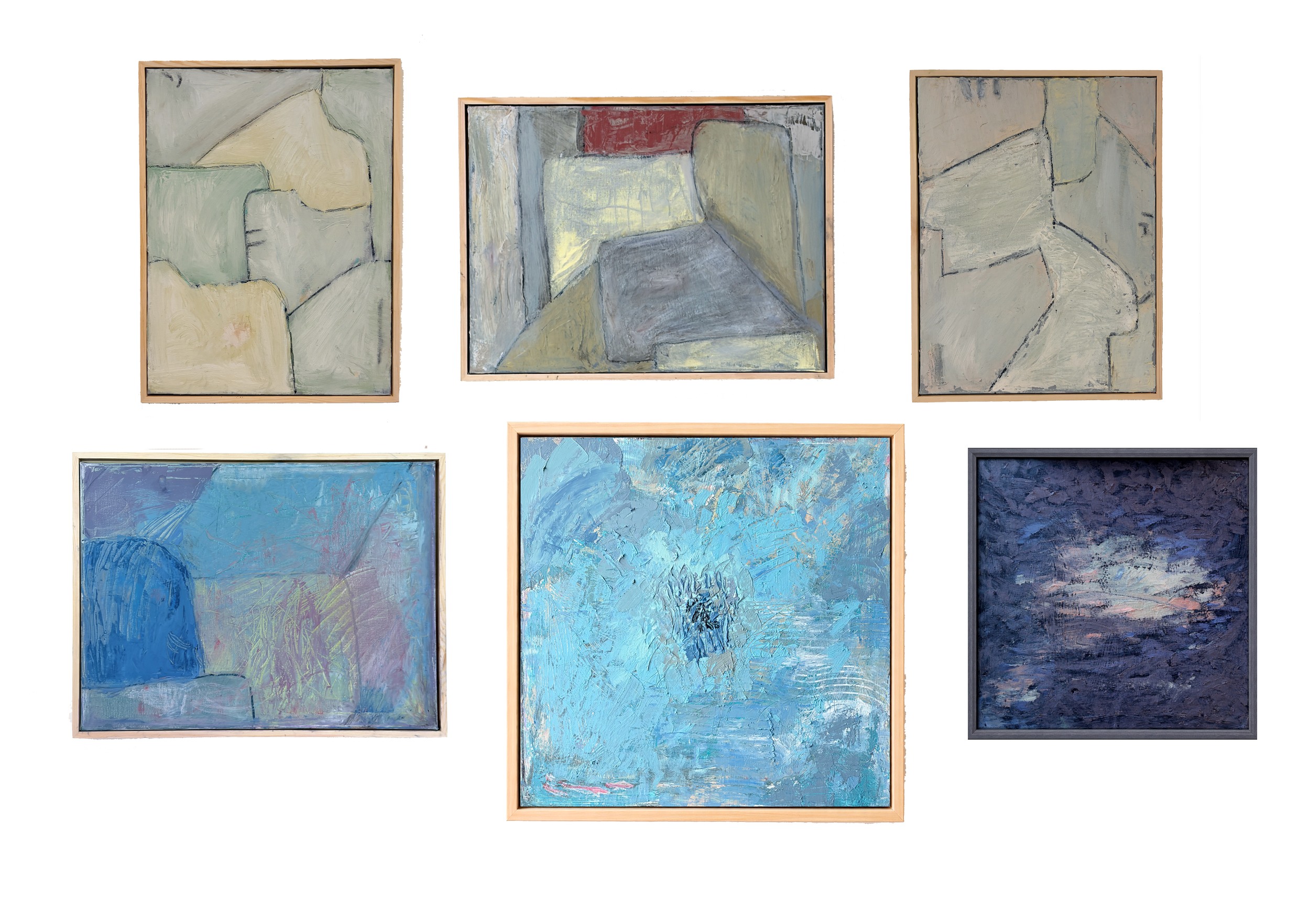 I’m drawn to paintings that feel spacious but not empty, with a kind of weathered lyricism. Some forms suggest landscape, coastline, architecture, or memory, but I’m less interested in depicting a place than in creating a felt experience of one. I want the work to hold both tension and calm: softness interrupted by edge, harmony complicated by friction.